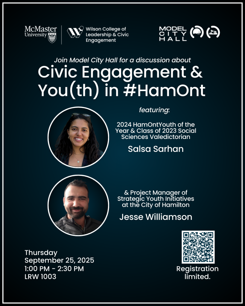 Join McMaster’s Wilson College of Leadership and Civic Engagement, Model City Hall, HamOntYouth of the Year – Salsa Sarhan, and Project Manager of Strategic Youth Initiatives at the City of Hamilton – Jesse Williamson, for a dynamic discussion exploring what leadership, civic engagement, and community-building in #HamOnt looks like. Whether already embedded in the civic fabric of Hamilton, or a newcomer to Hamilton and looking for where to start, this conversation will empower you(th) to become (more) civically engaged and explore how you(th) can play an active role in the community.